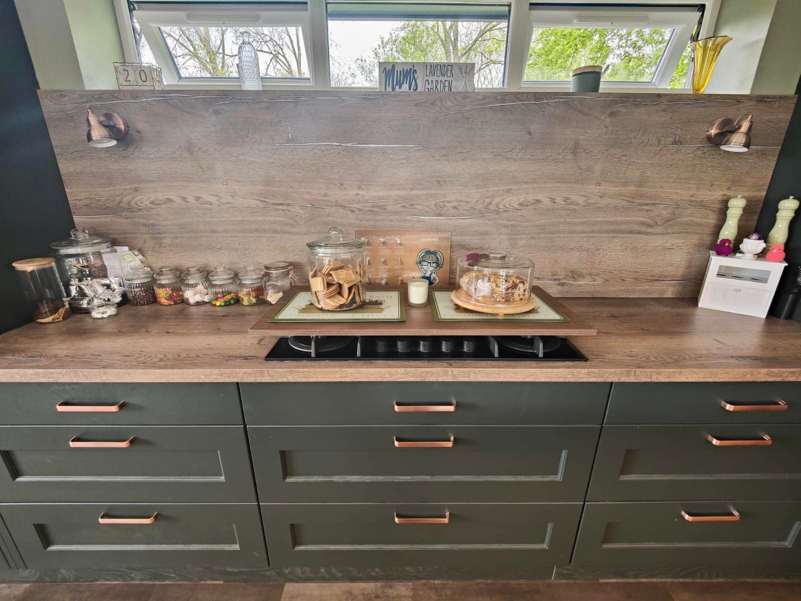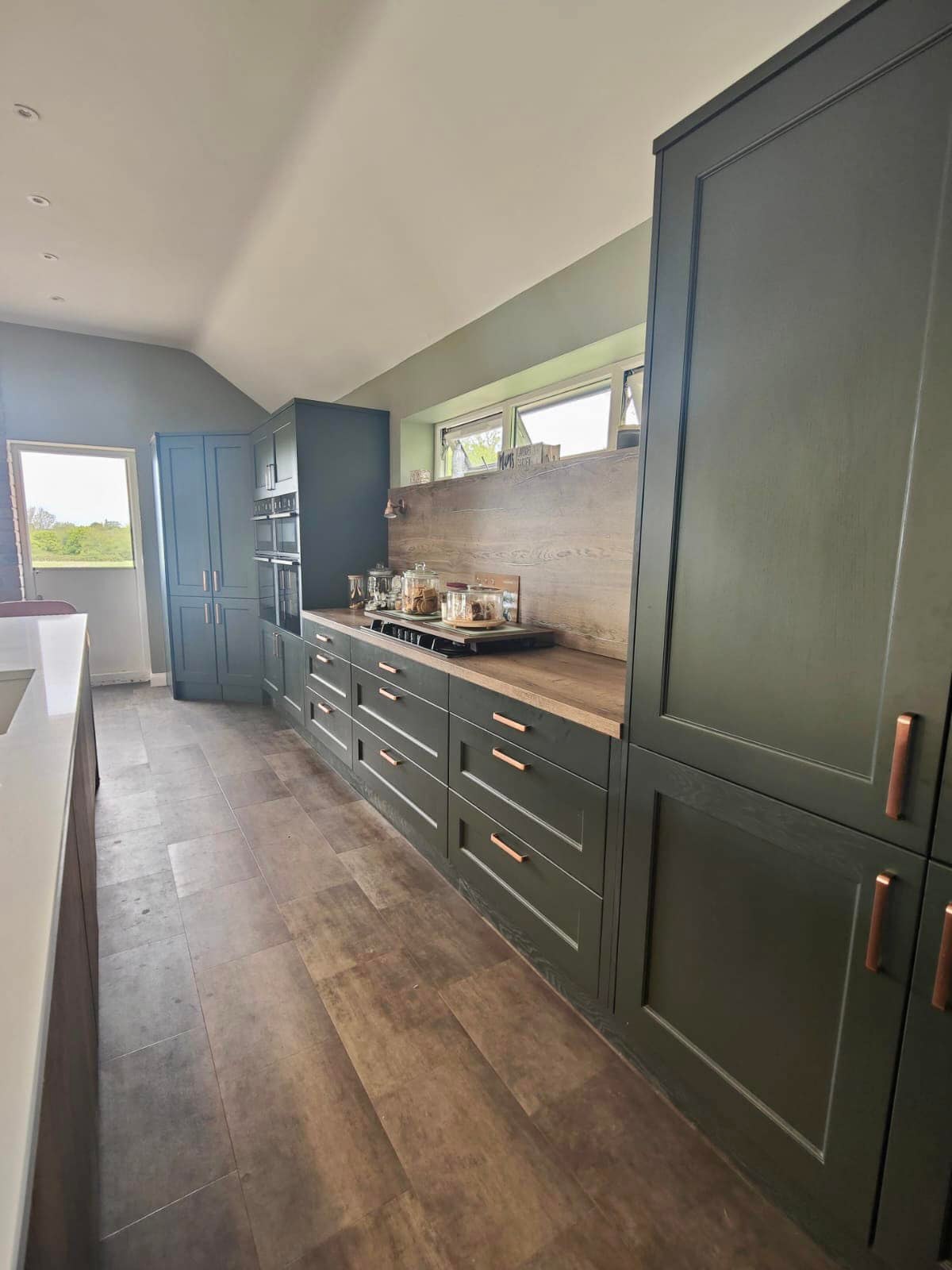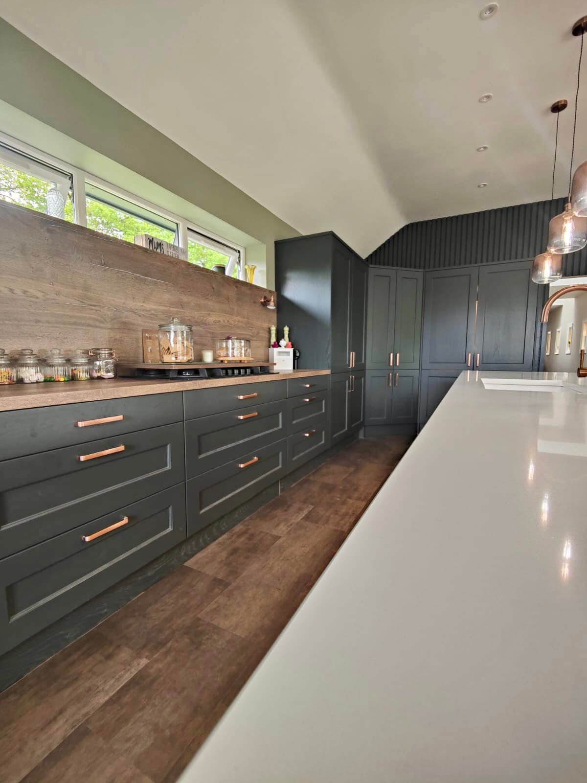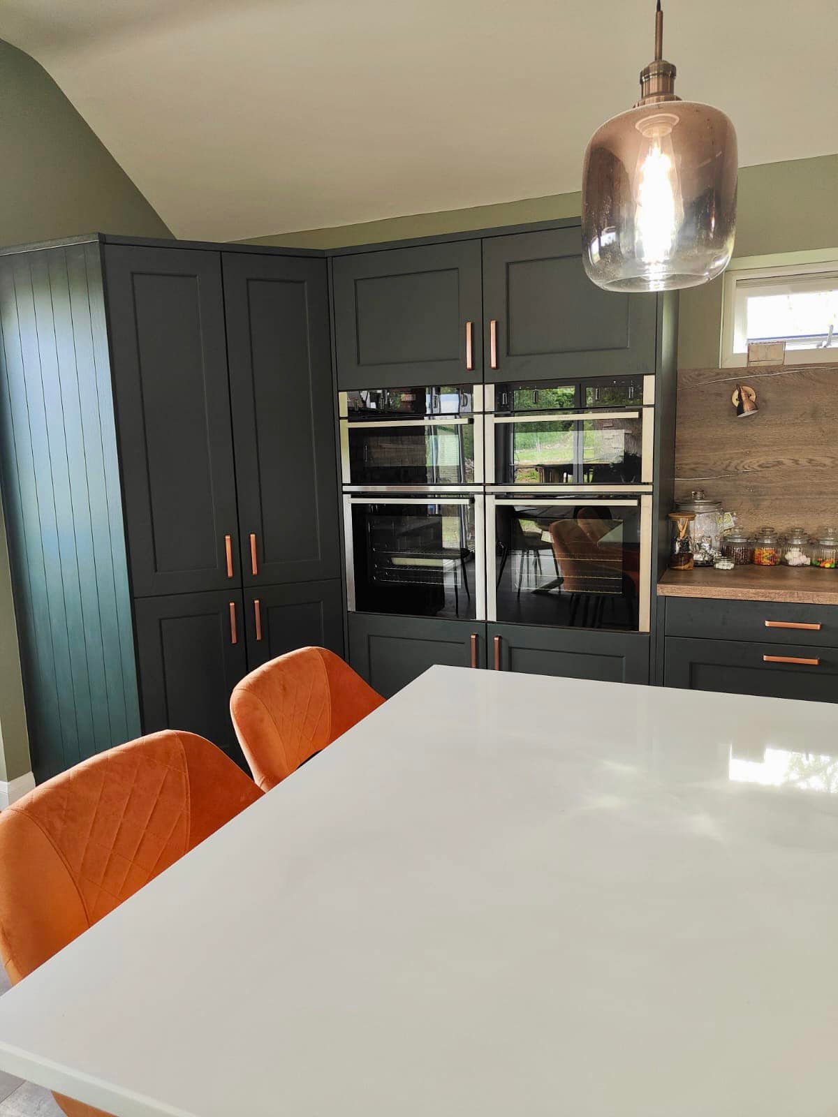 The first kitchen design that really embraced the Green colour palette was the McKelvey’s courtesy of our showroom in Oxford. We love the deep green against the rich wood effect of Pewter Halifax Oak in this Washington kitchen. Complete with dual walk-in corner larders and pantry unit.