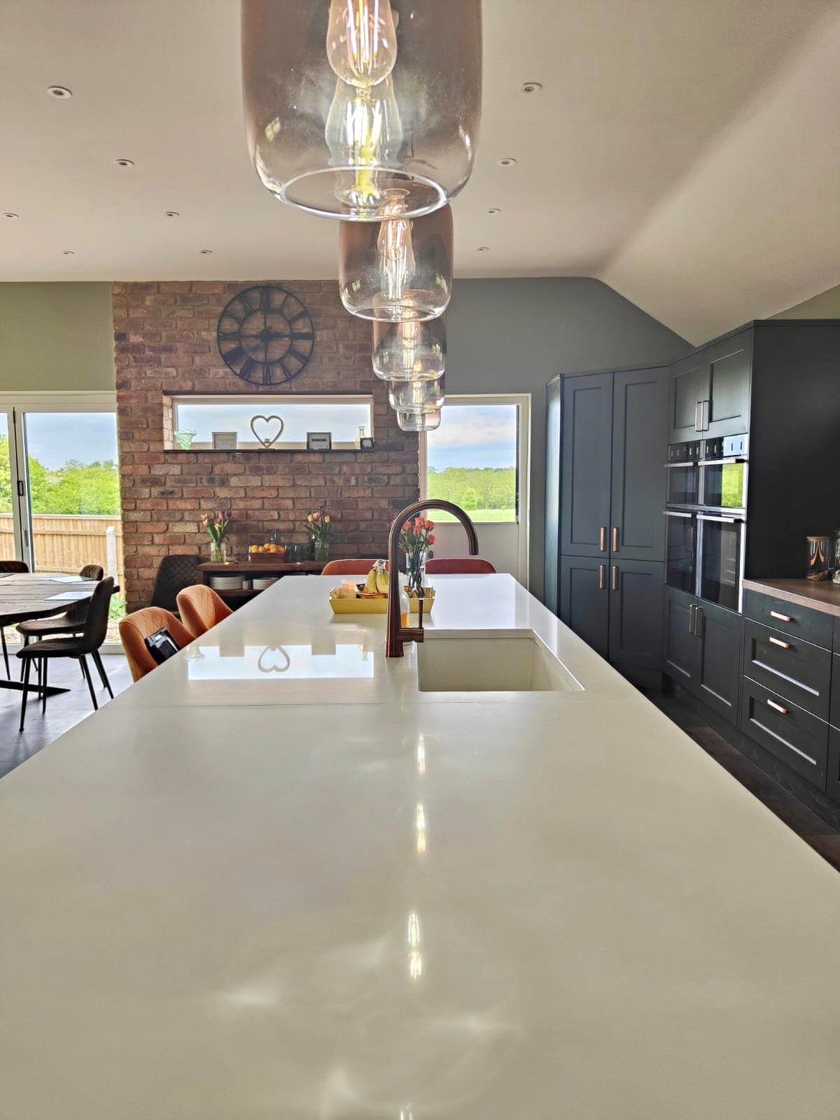 Thank you to the McLaneys for giving us the opportunity to create their wonderful new kitchen. This beautiful galley kitchen features our Washington range in Sage Green and a stylish Belfast sink. You can also spot a Joya dual lever gold tap from Caple and stunning Fantasy Brown worktops from Grantech.