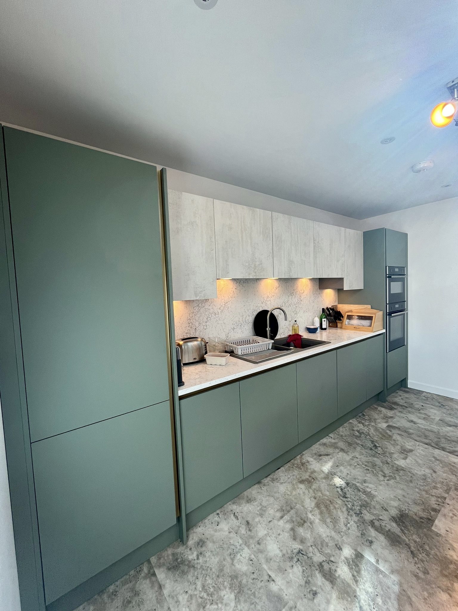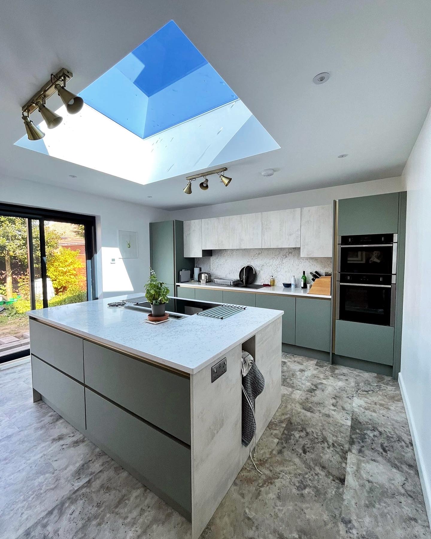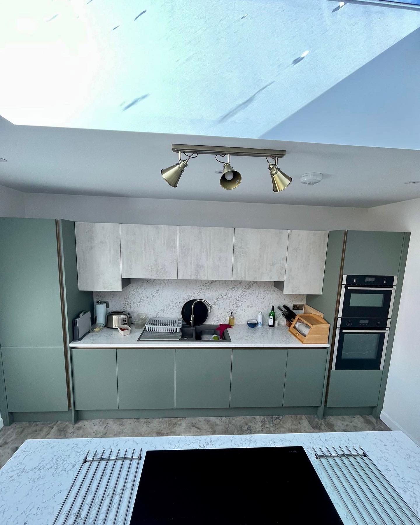 The Wightman family fell in love our LINEA collection and designed this incredible new kitchen featuring our new favourite shade of Green. The smooth matte doors were paired with textured White Chromix to create a dual tone effect while the use of Caesarstone Arabetto on the worktops and splashback help elevate this design to the next level.