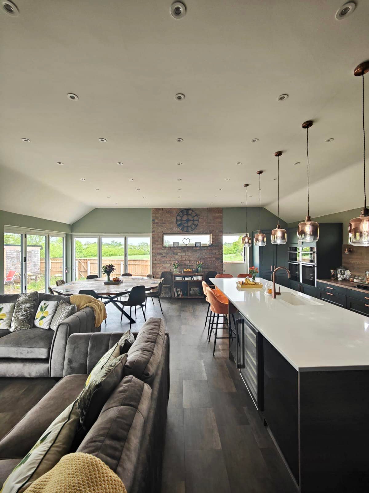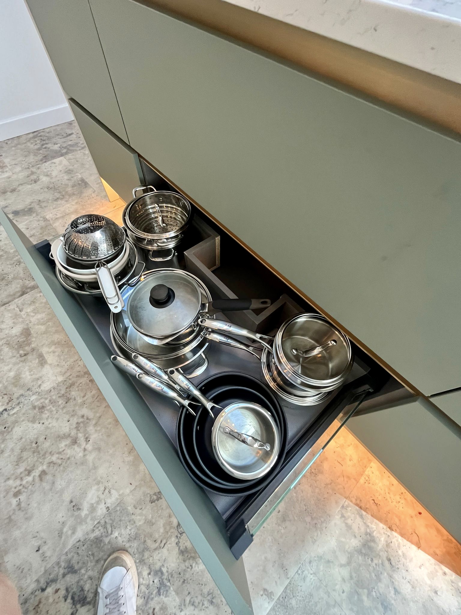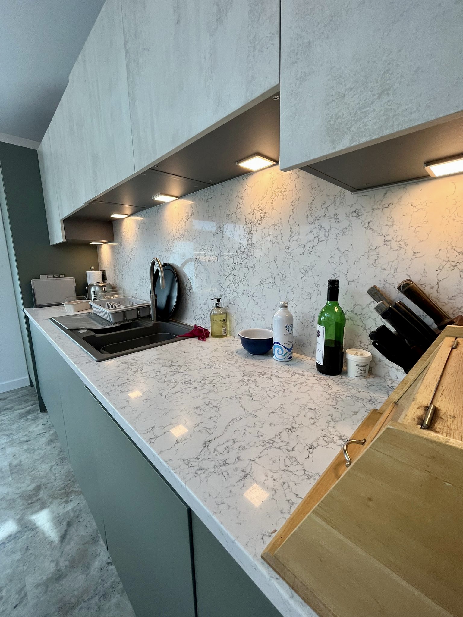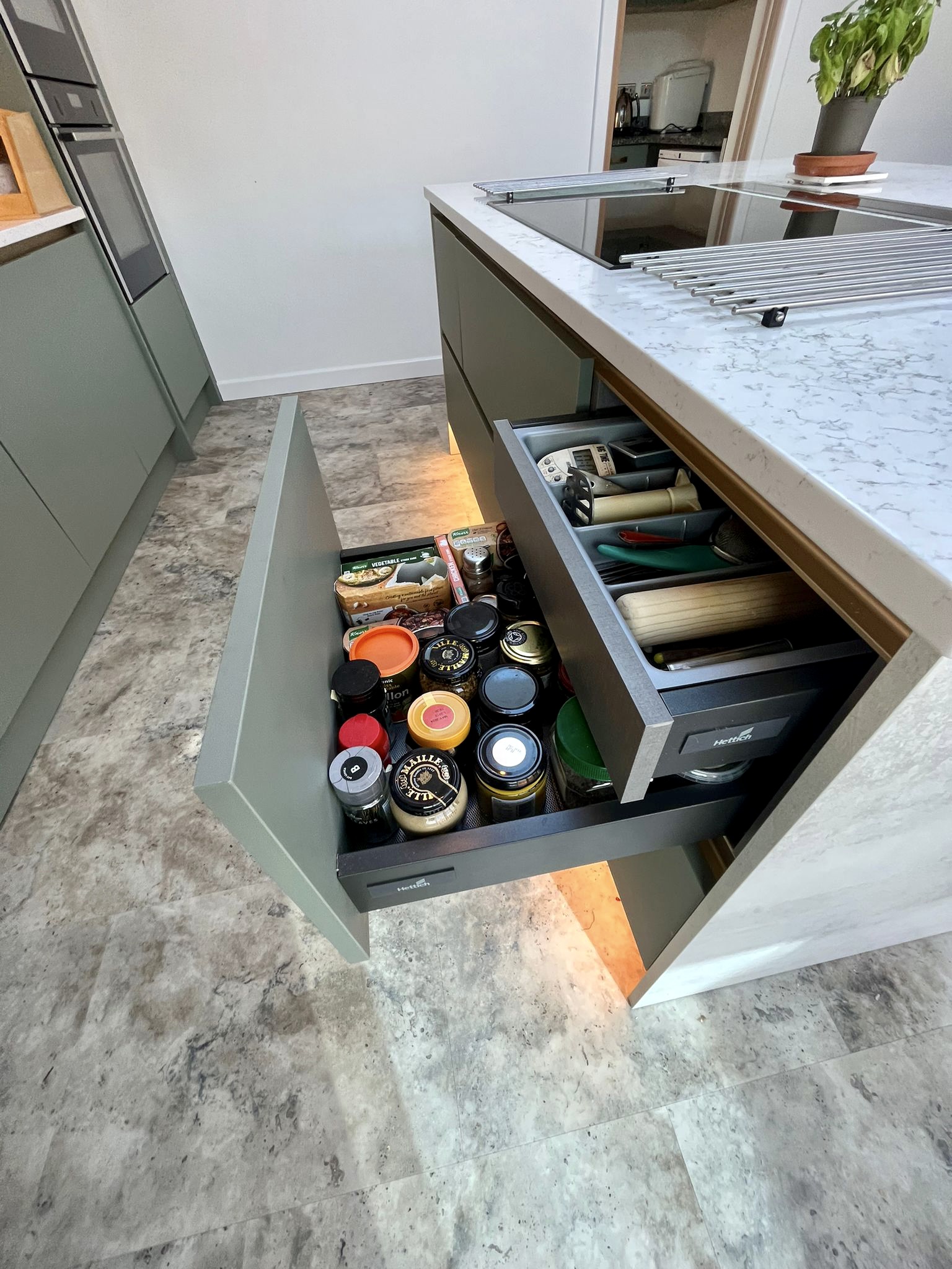 The Wightman family fell in love our LINEA collection and designed this incredible new kitchen featuring our new favourite shade of Green. The smooth matte doors were paired with textured White Chromix to create a dual tone effect while the use of Caesarstone Arabetto on the worktops and splashback help elevate this design to the next level.