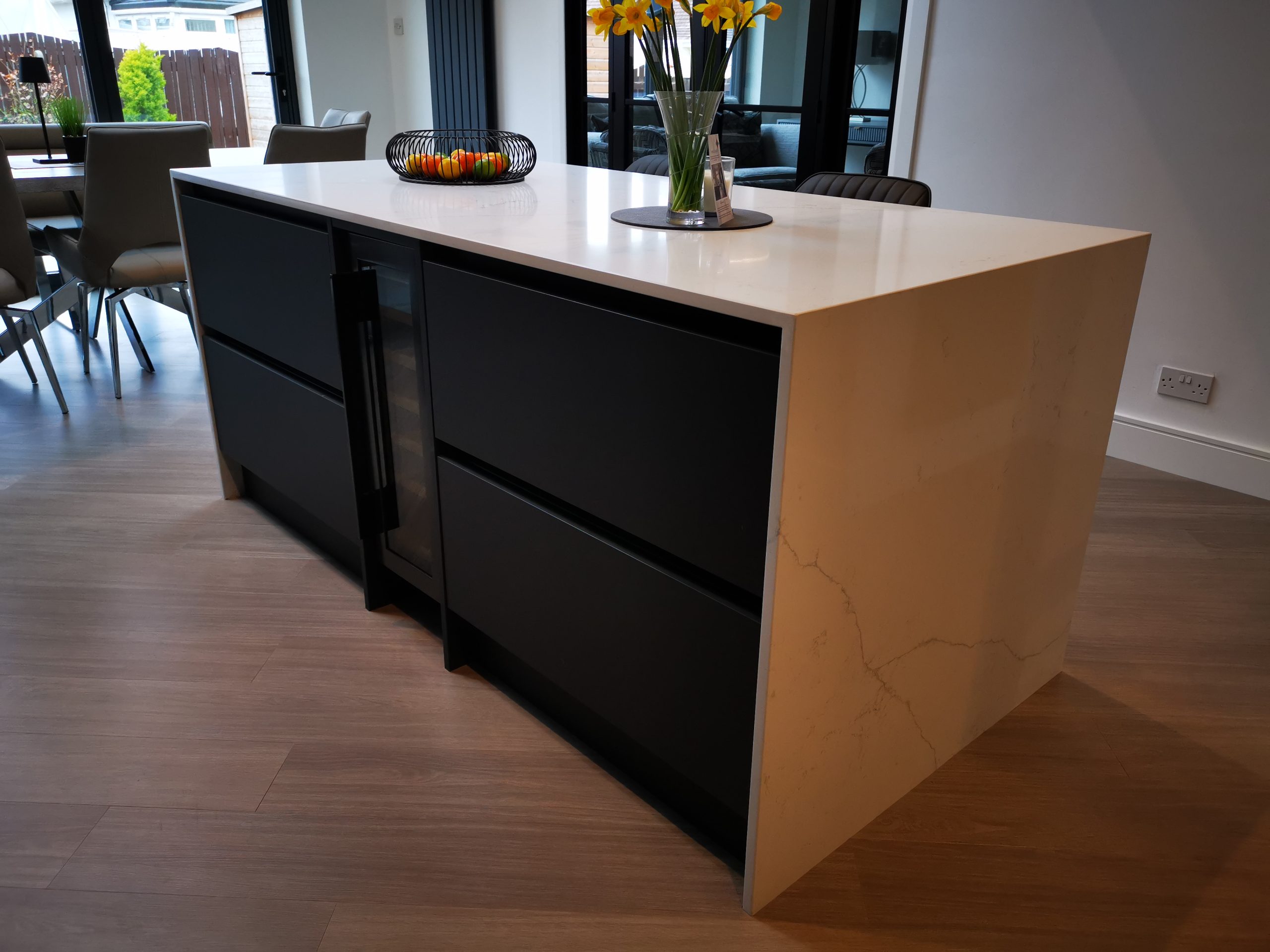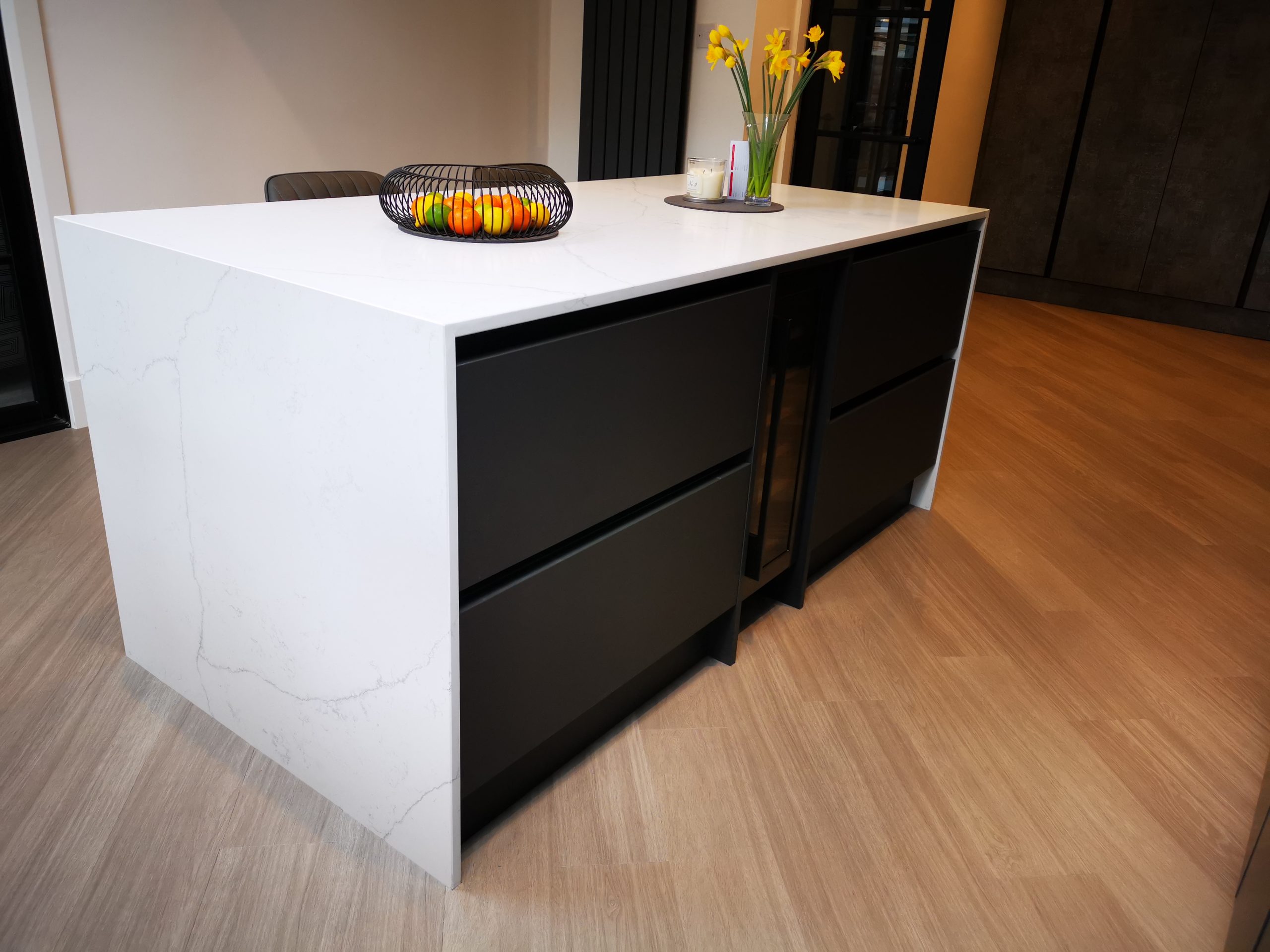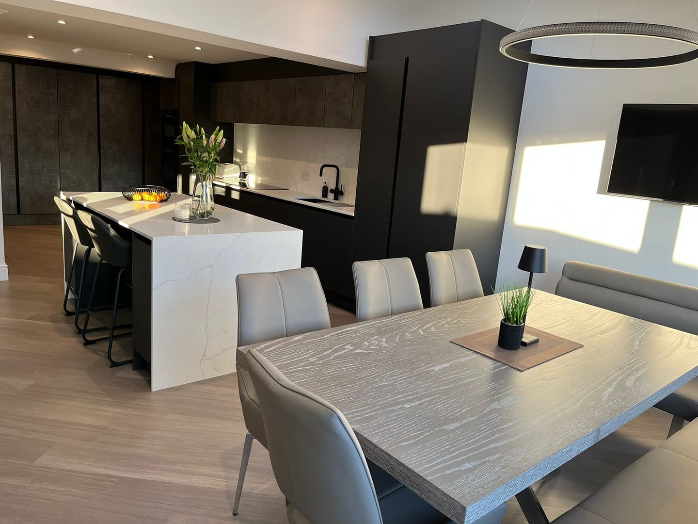 The McCreadie family were introduced to our Madison shaker door and opted for an incredible dual tone kitchen. They took advantage of our paint-to-order service to pair our elegant Cashmere décor with striking Farrow & Ball Pitch Black on the specially made extra tall units and wine racks. Splashes of Gold enhance this already outstanding design while the addition of Cosentino Silestone Lusso worktops and a Quooker tap highlight the impeccable taste of the McCreadie family.