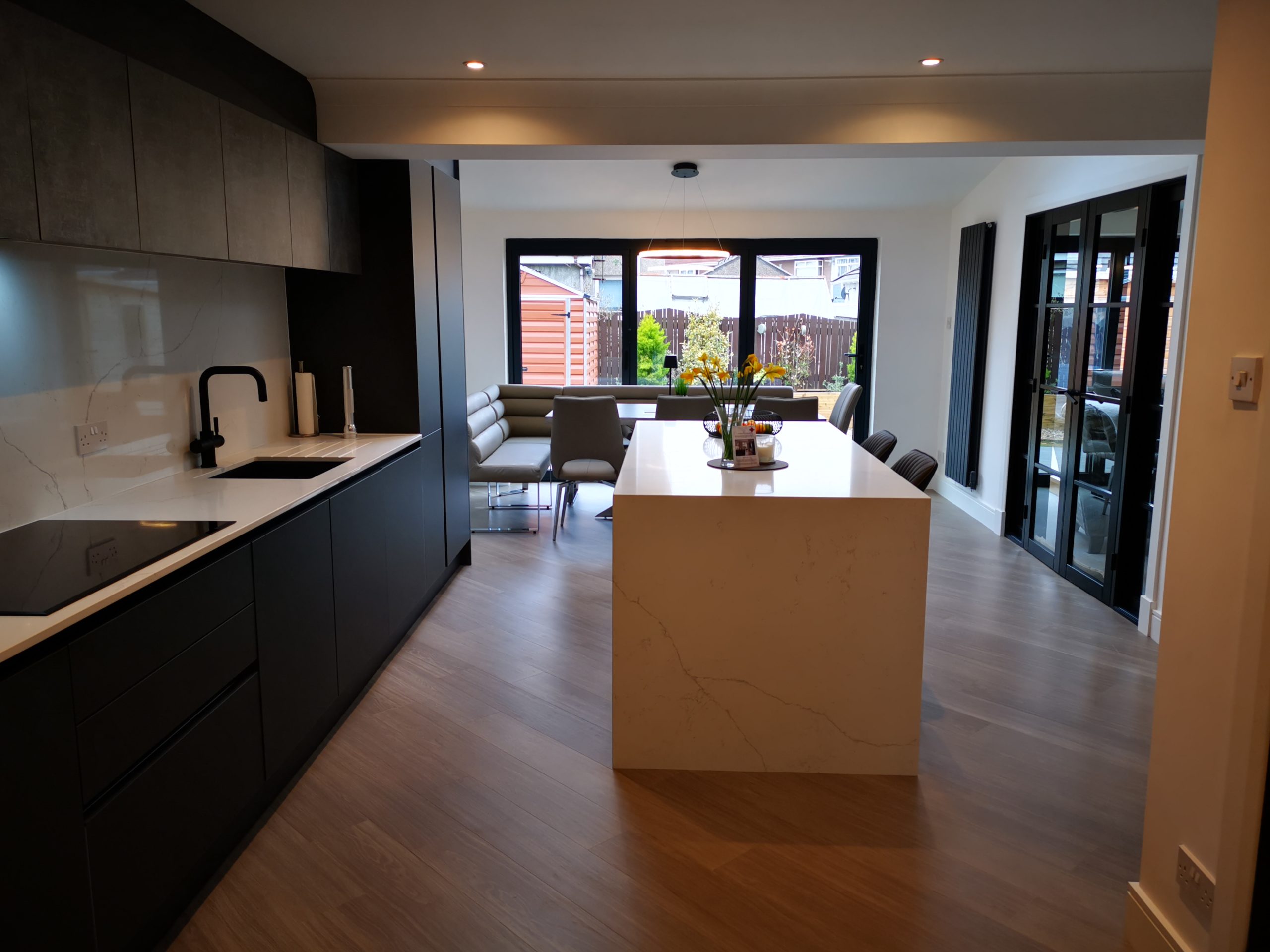 The McQuilter’s kitchen showcases our exclusive Linea collection in Graphite and Metalium. The darker doors are complimented perfectly by the stunning Quartz worktops from Rocca. This magnificent design has a vast array of storage solutions, including a tall gate larder and spacious pantry, to fulfil all their needs. “We’re delighted with our new space, particularly fab when the sun is shining! Will recommend far and wide!”