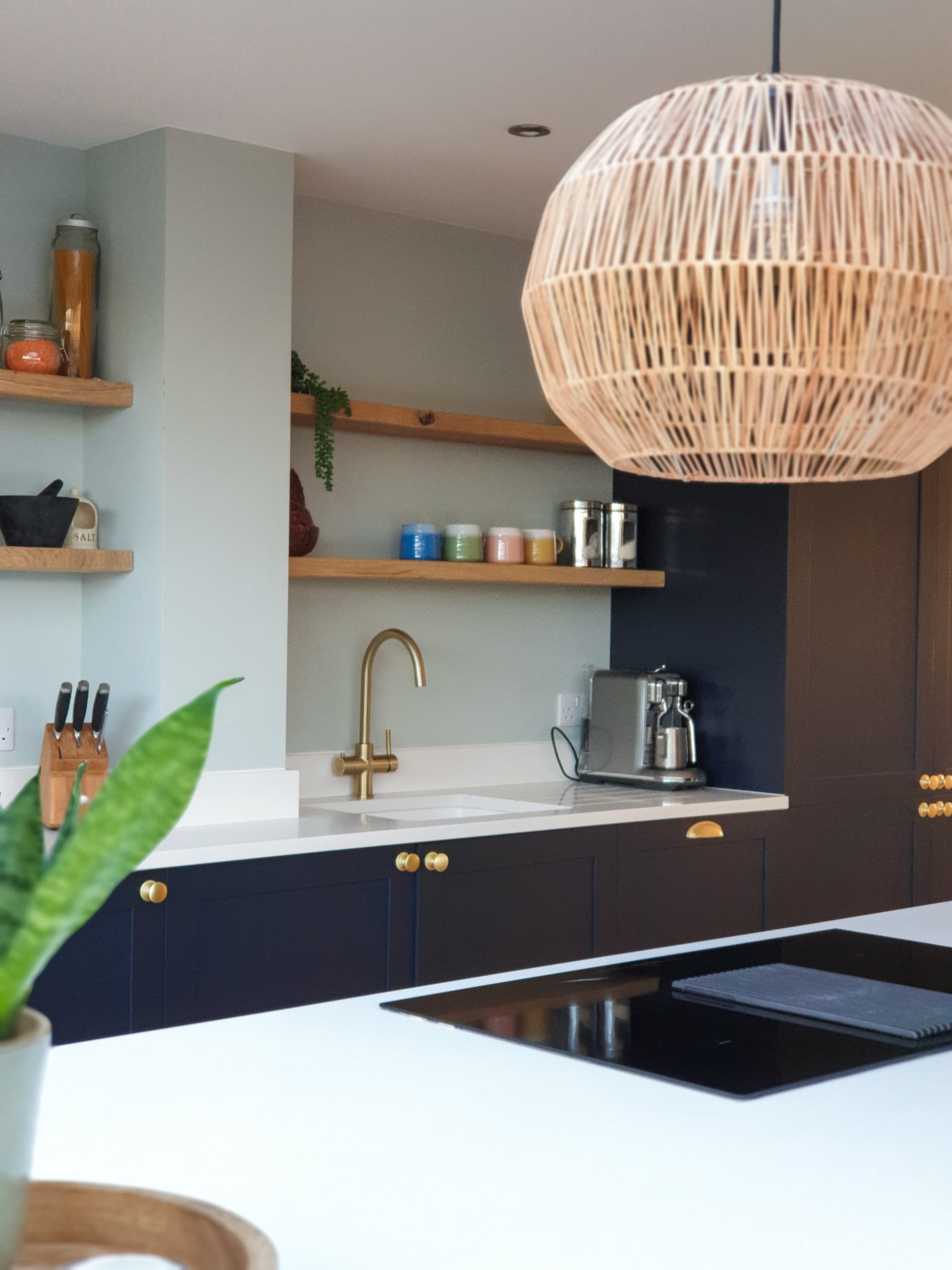 The Tierney’s chose our solid wood Alana door in paint-to-order Indigo on the outer runs and paired it with Porcelain on the island. The contrasting colours with the white quartz work surfaces perfectly compliment the brass accessories and the customer’s choice of wooden flooring and shelving. They even chose a matching wood internal which is displayed beautifully in the bespoke pantry larder that was designed specifically with their needs in mind.