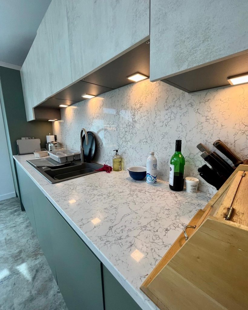 The Wightman family fell in love our LINEA collection and designed this incredible new kitchen featuring our new favourite shade of Green. The smooth matte doors were paired with textured White Chromix to create a dual tone effect while the use of Caesarstone Arabetto on the worktops and splashback help elevate this design to the next level.
