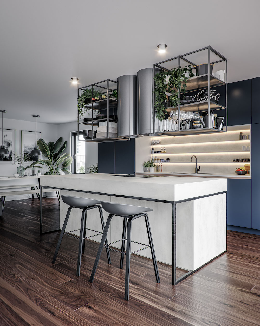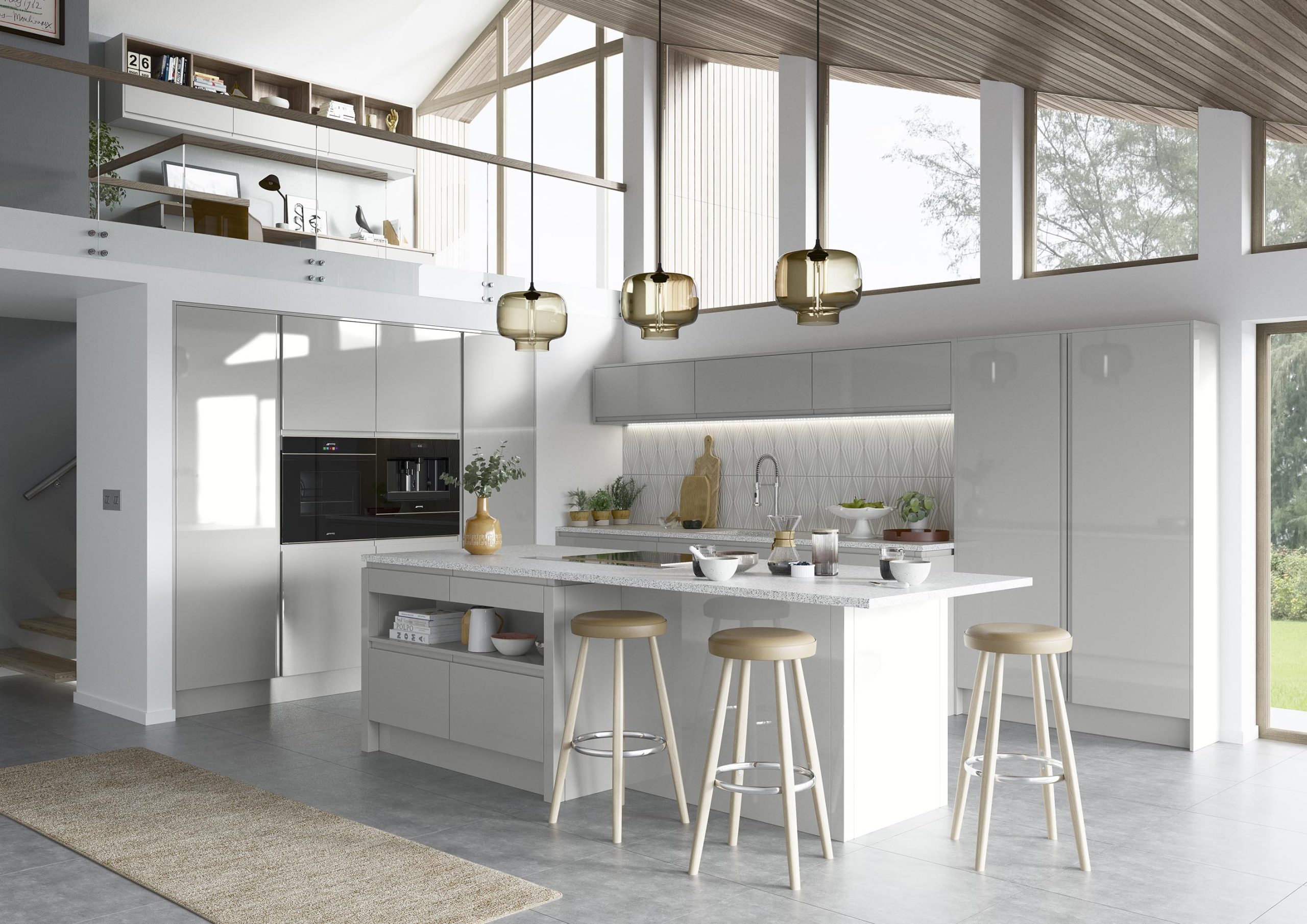 glossy white kitchen with concrete and wood accents