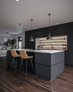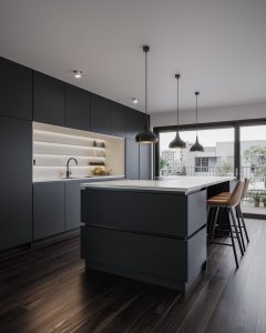 Importantly, every Linea kitchen is built using premium materials and expert craftsmanship. Specifically, it features slab-style MDF doors (18 mm thick) with colour‑matched 1 mm ABS edging applied using PUR adhesive for durability and moisture resistance. Additionally, the anti-fingerprint finish ensures surfaces stay clean and pristine. In combination with soft‑close hinges and customizable sizing, Linea delivers a blend of functionality and aesthetics.