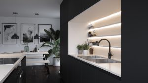 Our LINEA Matte Black Handleless Kitchen is bold and contemporary. Matte Black doors just ooze sophistication. The Kitchen has bespoke open shelving , double oven in black & silver. The Kitchen is handleless with silver rails and designed by the Kitchen Depot.
