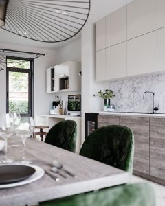 The Kitchen Depot's LINEA kitchen range in matte light grey and white river oak decors.Displayed in a beautiful kitchen design with deep forrest chairs.